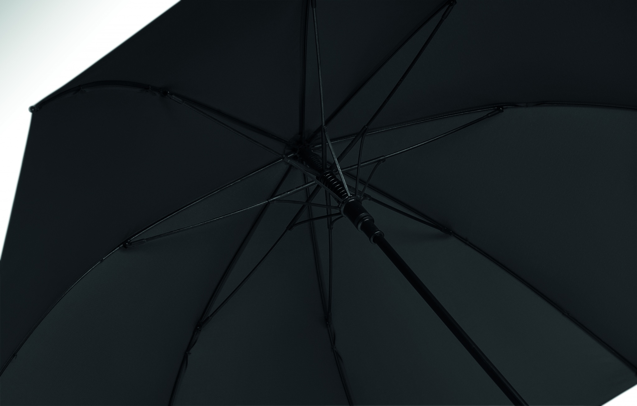 27'''' Regenschirm aus 190T RPET-Pongee. Windbeständig. Stock und Stangen aus Fiberglas. Spitzen und Krone aus Kunststoff. Griff aus Weizenstroh und recyceltem ABS. Automatische Öffnung, manuelle Schließung.