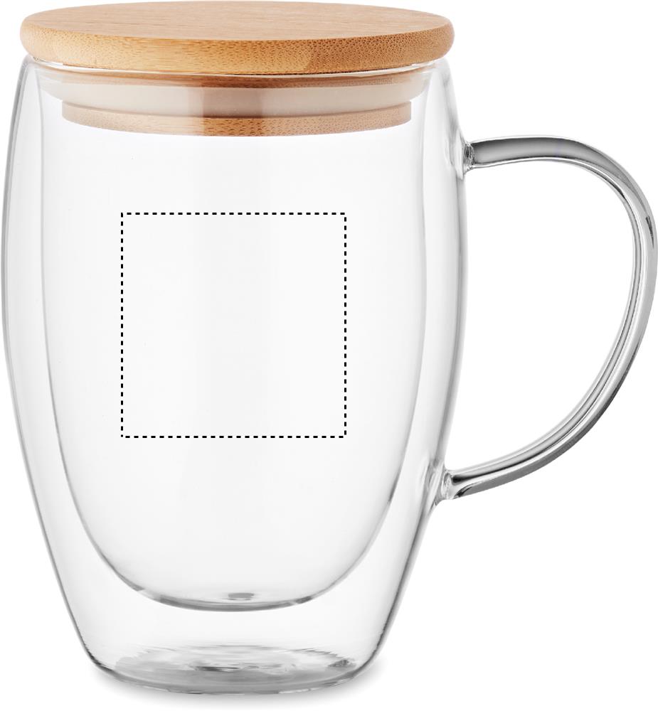 Doppelwandiges Borosilikatglas mit Henkel. Deckel aus Bambus. Füllmenge: 350 ml.