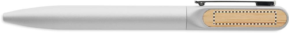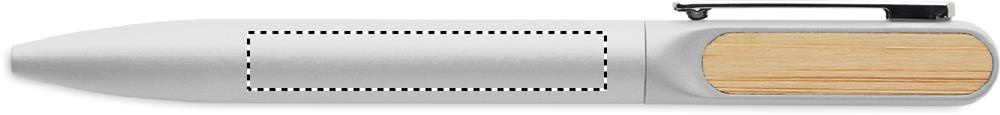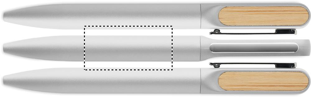 Drehkugelschreiber mit Schaft aus recyceltem Aluminium, oberer Part aus recyceltem ABS mit Inlay aus Bambus und Clip aus Metall. Blaue Tinte.
