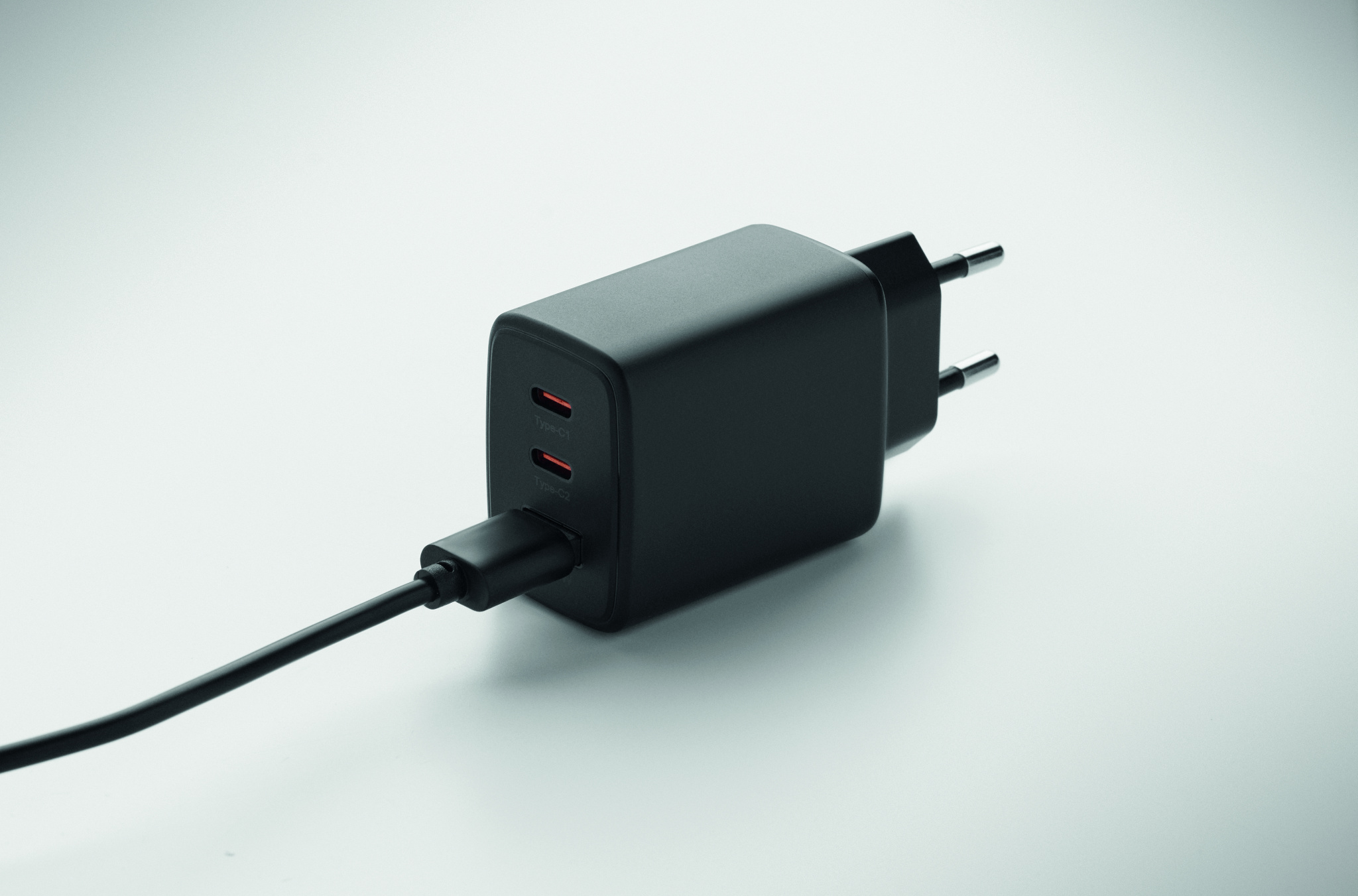 EU 2-poliges GaN-Wandladegerät mit 65 W Schnellladung, 1 USB-A- und 1 Typ-C-Anschlüssen. Unterstützt Power Delivery-Technologie. Nicht für den Einsatz in Großbritannien geeignet.
