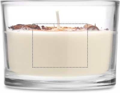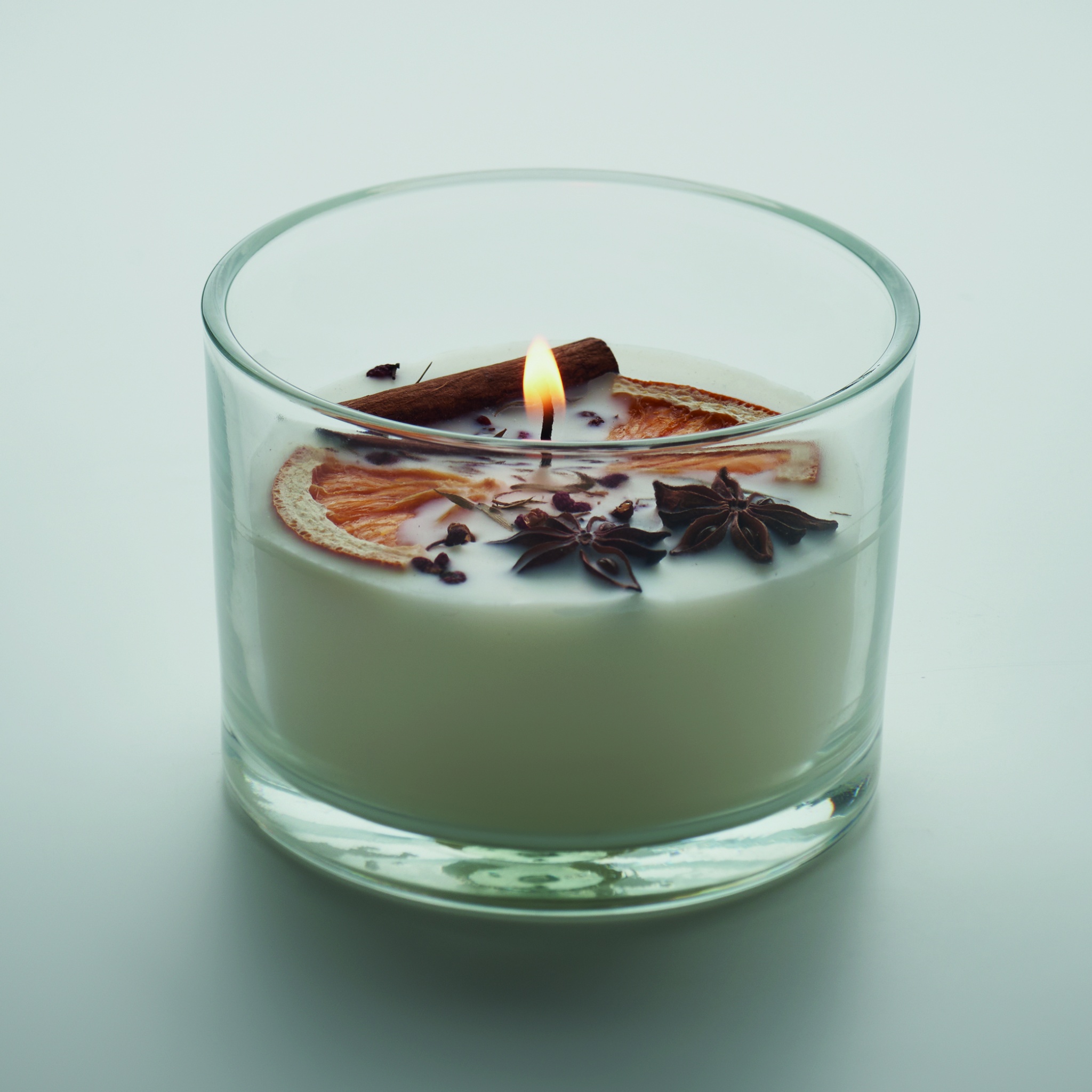 Duftende Kerze im Glas mit getrockneten Blumen und Früchten. Wachs auf pflanzlicher Basis. Aroma: Zimt & Zitrone. 300 g. Brenndauer: 50 Stunden.