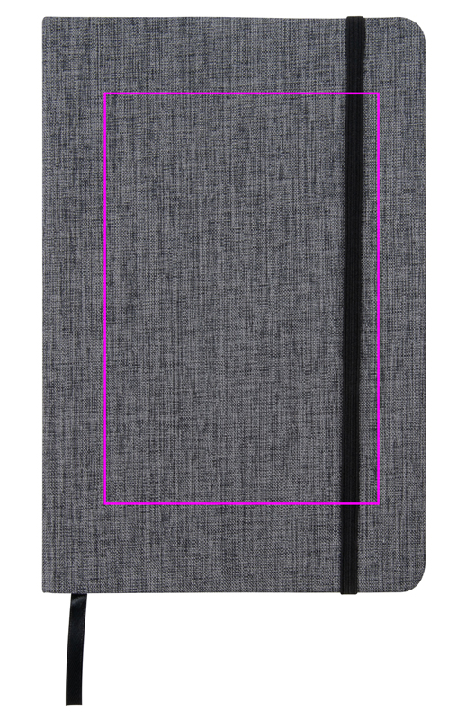 A5 Notizbuch mit edlem 300D Canvas Polyester Cover, schwarzem Gummiverschluss und Lesezeichen. 160 linierte Seiten. Ihr Logo drucken wir auf das Cover.