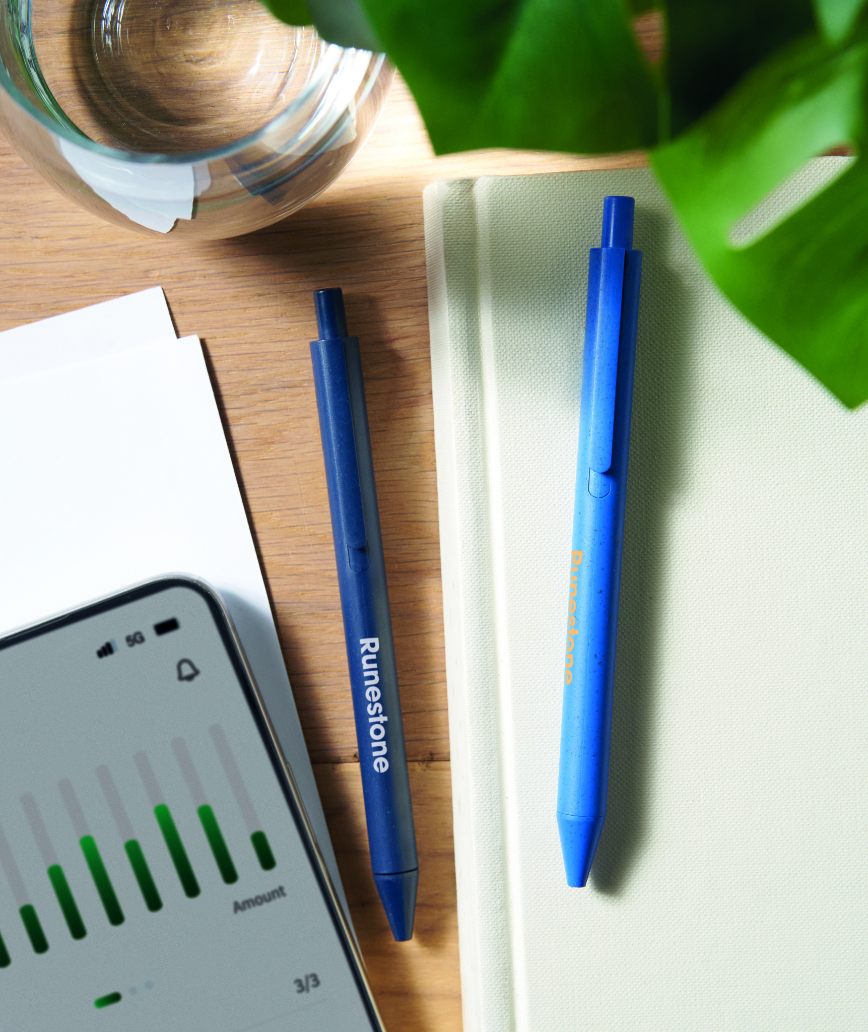 Druckkugelschreiber aus Weizenstrohhalm- und ABS-Kunststoff Gemisch (je 50%). Blaue Tinte.