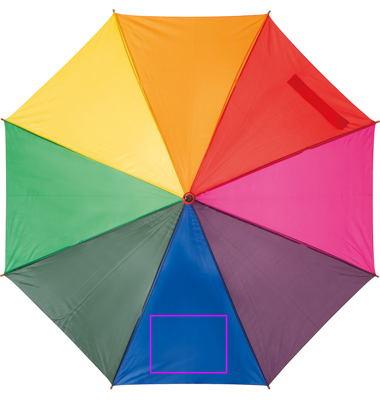 Attraktiver, mehrfarbiger Automatik-Stockschirm mit gebogenem Holzgriff. Ihr Logo drucken wir auf ein Segment.
