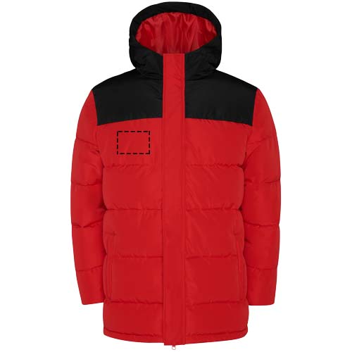 Wattierte Jacke mit fester Kapuze. Reißverschluss auf der Vorderseite, verdeckt durch eine Knopfleiste. Kinnschutz. Zwei Seitentaschen mit Reißverschluss. Elastische Bündchen.