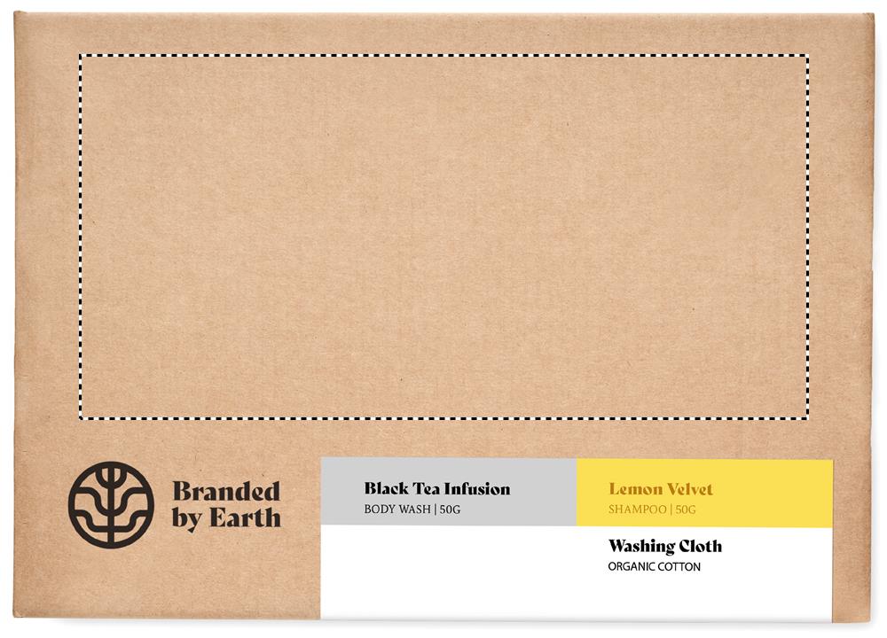 Unisex-Körperpflege-Set von Branded By Earth für unterwegs. Enthält 24 Portionen vegane Duschseife und Shampoo à 4g. Verpackt in Papierhülsen. Inkl. Seiftuch/Beutel aus Organic Cotton. Lieferung in einer Box aus recyceltem Papier. Hergestellt in der EU.