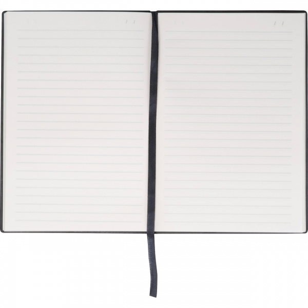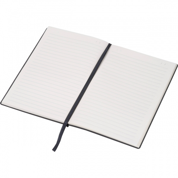 A5 notebook with a flexible soft cover made of PU, a bookmark, and 192 lined pages made from recycled paper. Your logo is printed on the cover below the braided area.