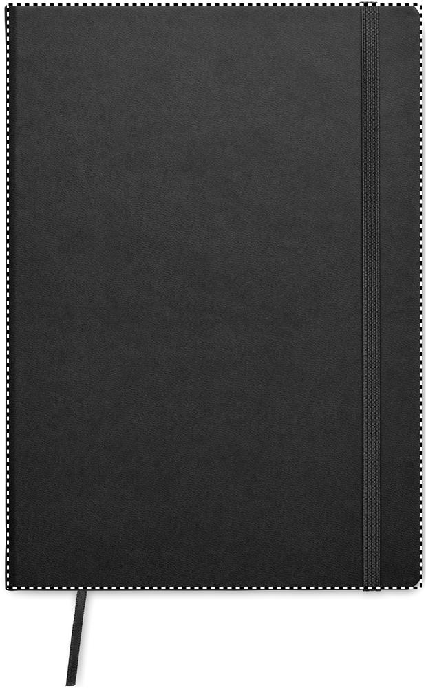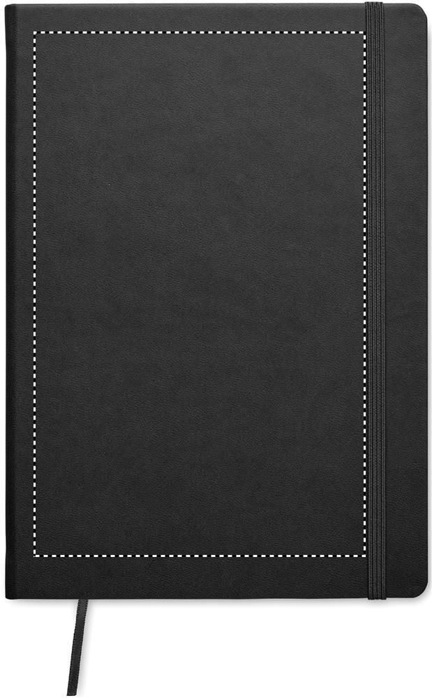 A5 notebook with hard PU cover. Casebound. 200 lined pages (100 sheets) in recycled paper (80 gsm). Matching elastic closure strap and ribbon page-marker. Made in EU.