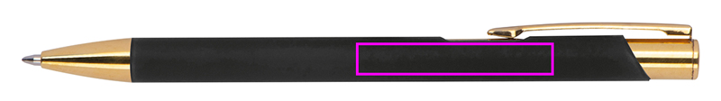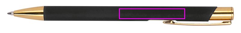 Ball pen made of aluminum with gold applications, rubber finish and blue writing large capacity refill. Your logo will be lasered on the right side of the clip, it will appear in gold color.