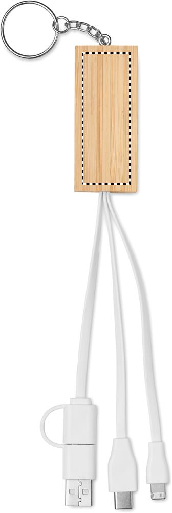 Bamboo key ring with phone stand functionality and integrated charging cable. Input: 2-in-1 Type-C <(>&<)> Type-A. Output: Type-C and micro-B (2 in 1 pin).