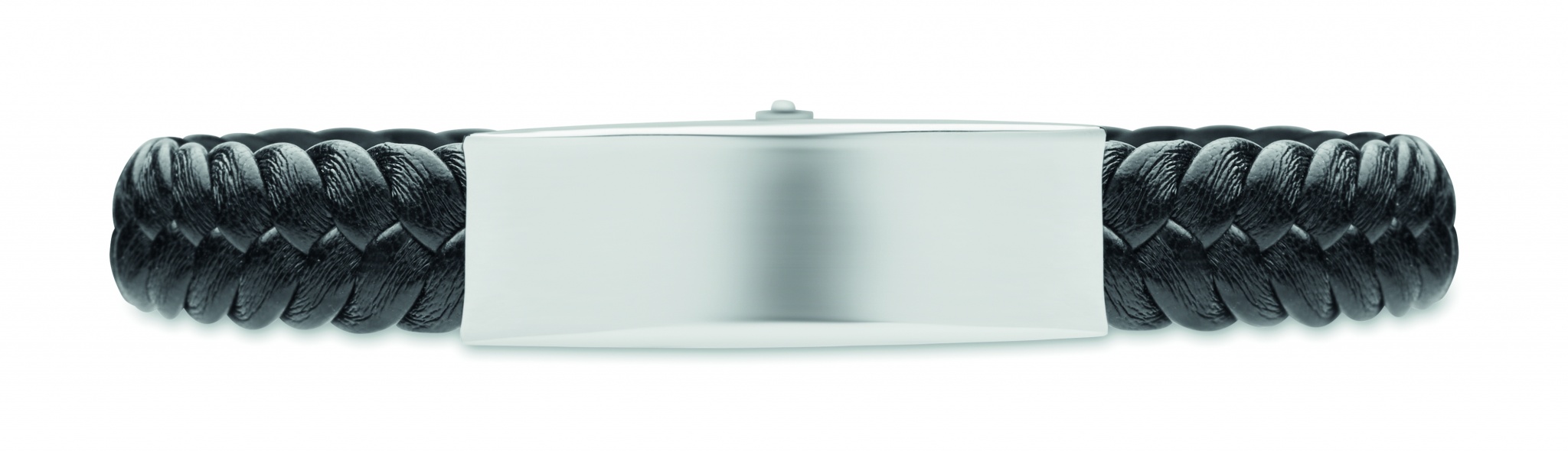 Braided faux leather cuff bracelet with polished steel hardware. Push-lock clasp. Wrist circumference: 21 cm.