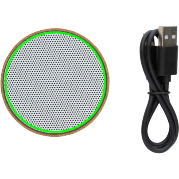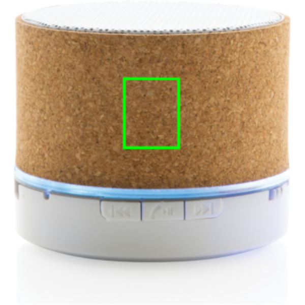 3W wireless speaker made with FSC® 100% cork casing. The speaker is equipped with a 400 mAh battery to ensure up to 3 hours of playing time and BT5.1 for smooth connection and clear sound. The speaker has an integrated light when switched on. Connection range up to 10 metres. With mic and pick up function to answer calls. Packed in FSC mix FSC® box. Including RCS certified recycled TPE charging cable. Item and accessories 100% PVC free.