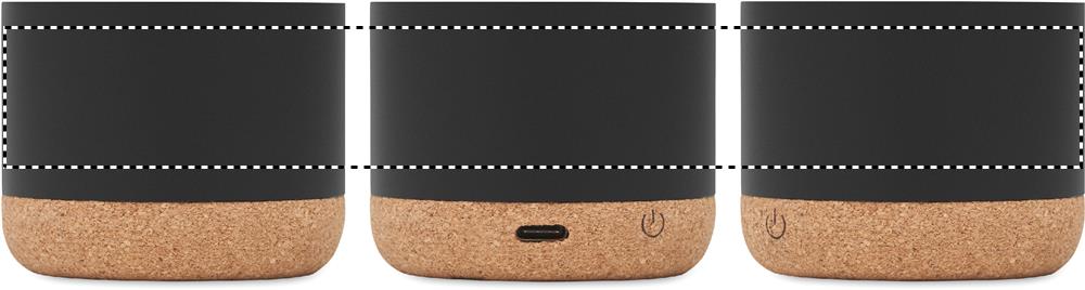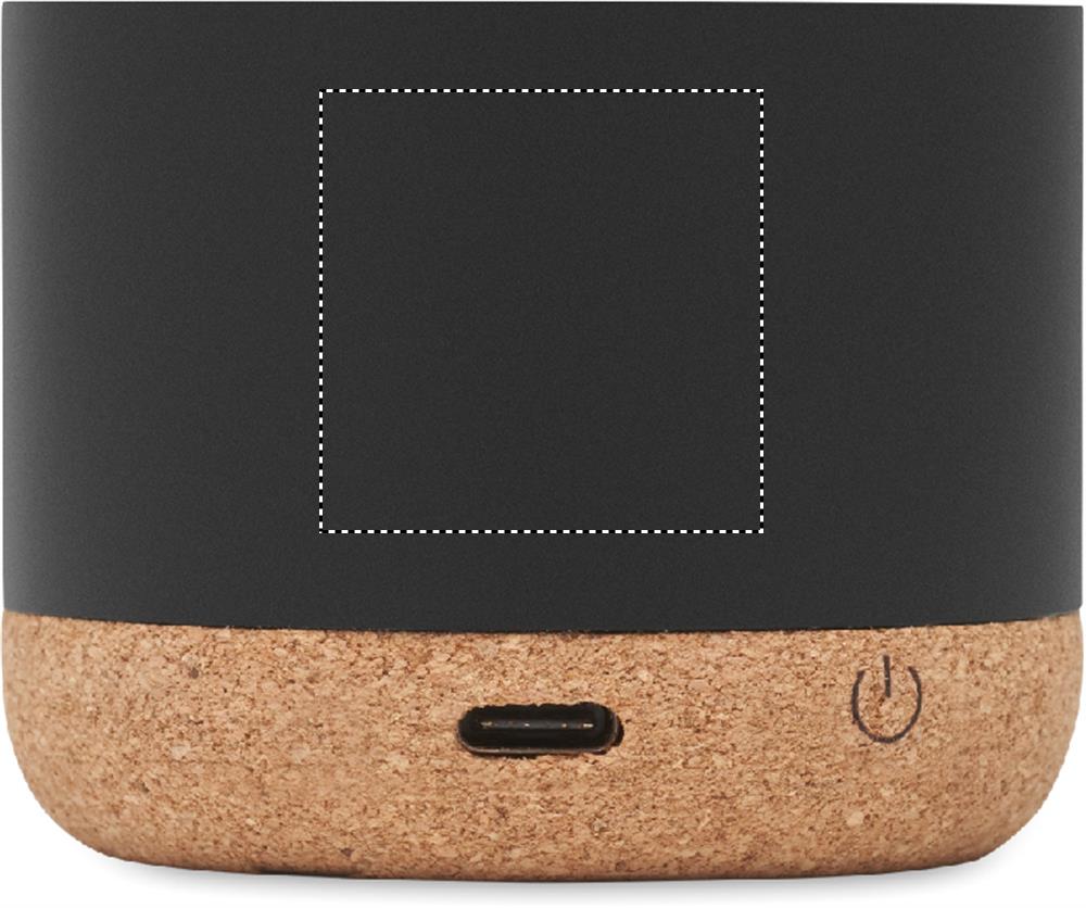 5.3 wireless speaker in recycled aluminium casing with cork base and bamboo detail on top. 1 Rechargeable Li-ION 400 mAh battery included. Output data: 3W, 3 Ohm and 5V. Playing time approx. 3h.