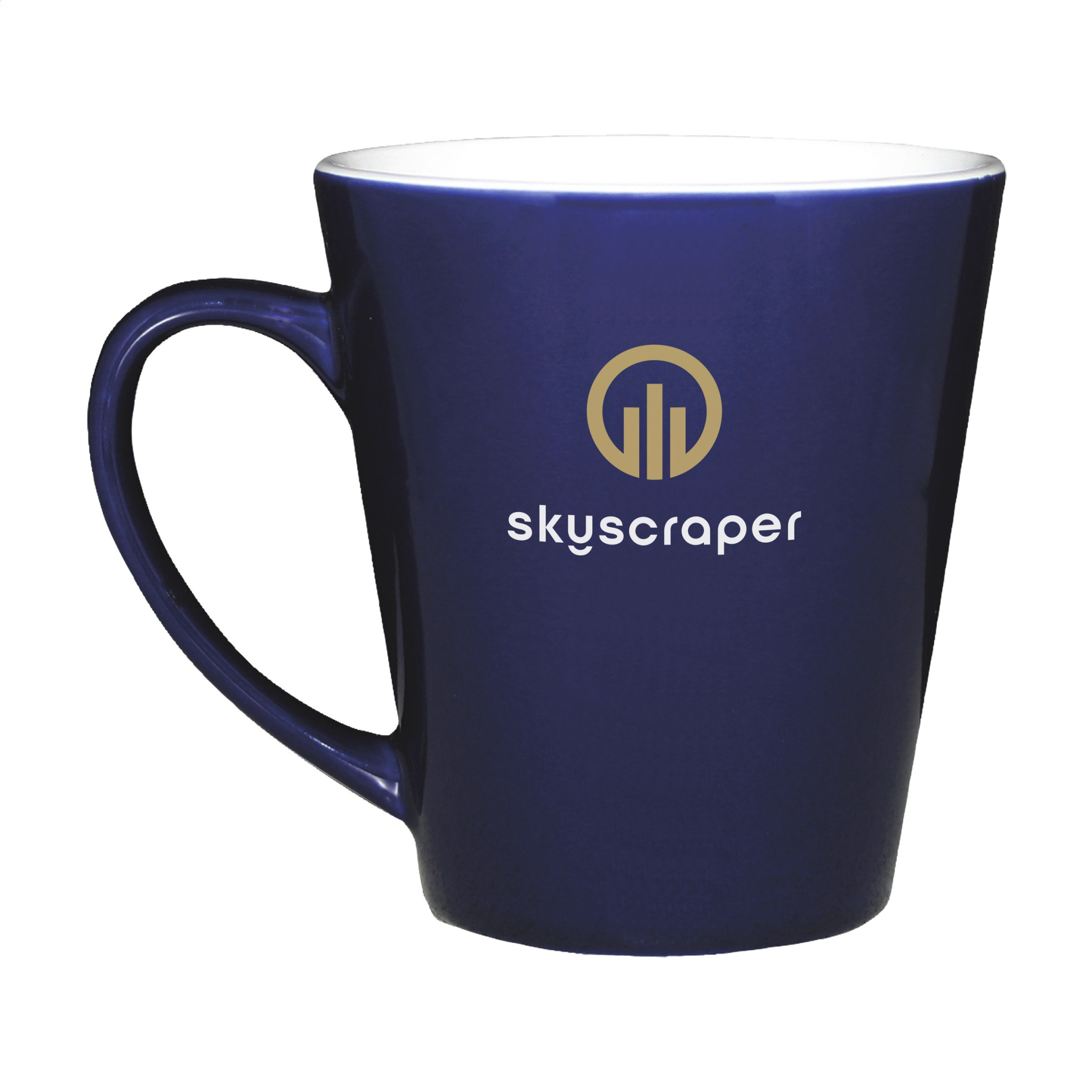 Contemporary quality ceramic mug. In all white or with a coloured exterior. Dishwasher safe. Capacity 310 ml. The imprint is dishwasher tested and certified: EN 12875-2.