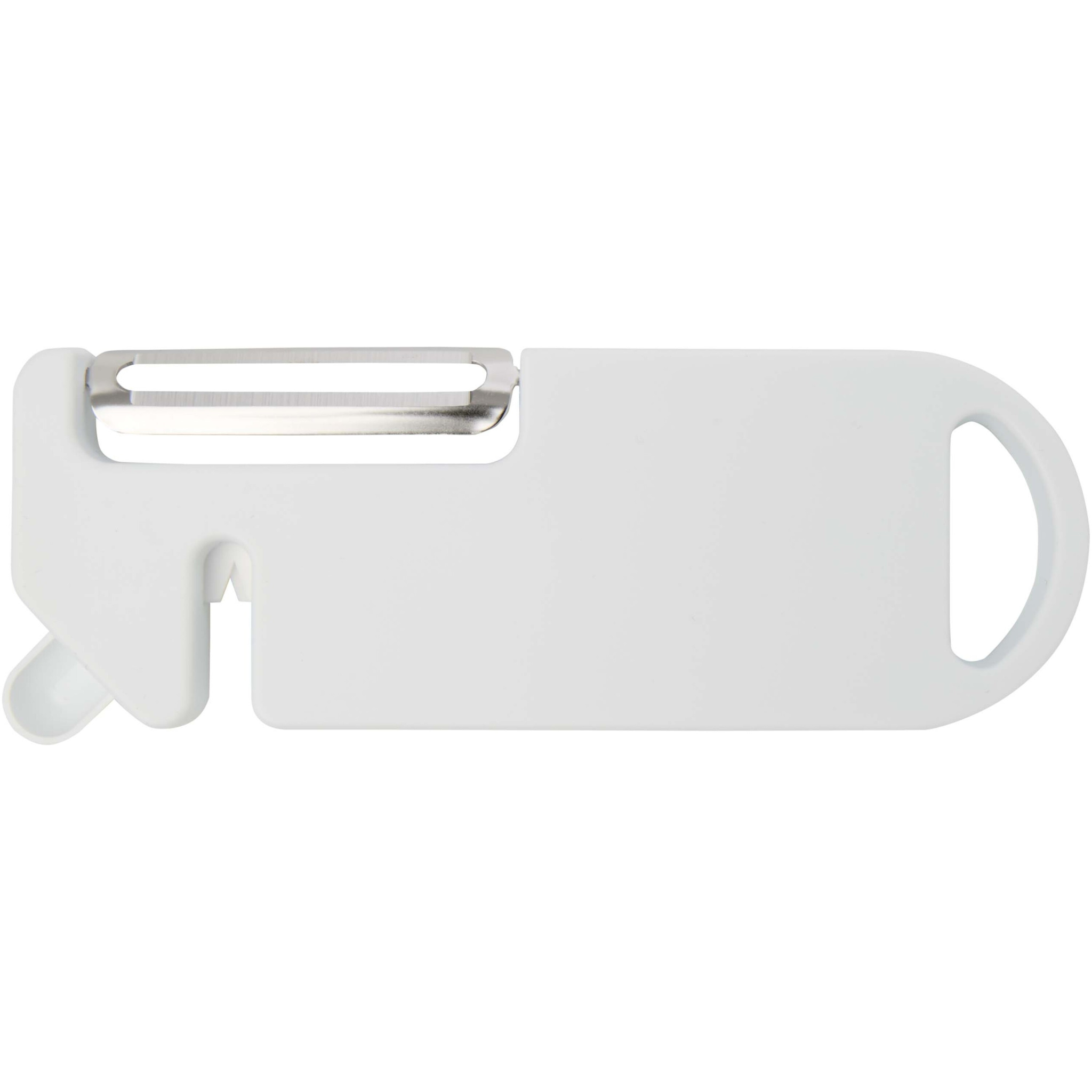 This multi-purpose kitchen tool combines four essential functions in one compact design. Made from recycled plastic, it features a peeler, bottle opener, knife sharpener, and a pointed tip for removing potato blemishes. A built-in hanging hole allows for easy storage. Practical and space-saving, it’s a versatile must-have for every home cook.
