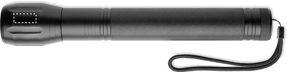 Large aluminium zoomable 1 LED flashlight torch and detachable strap. Output: 300 lumen. 3 D batteries excluded.