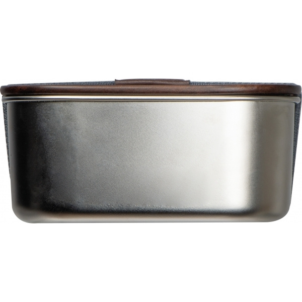 Lunch box made of recycled stainless steel, with an acacia wood lid and elastic band. Capacity 1000 ml.