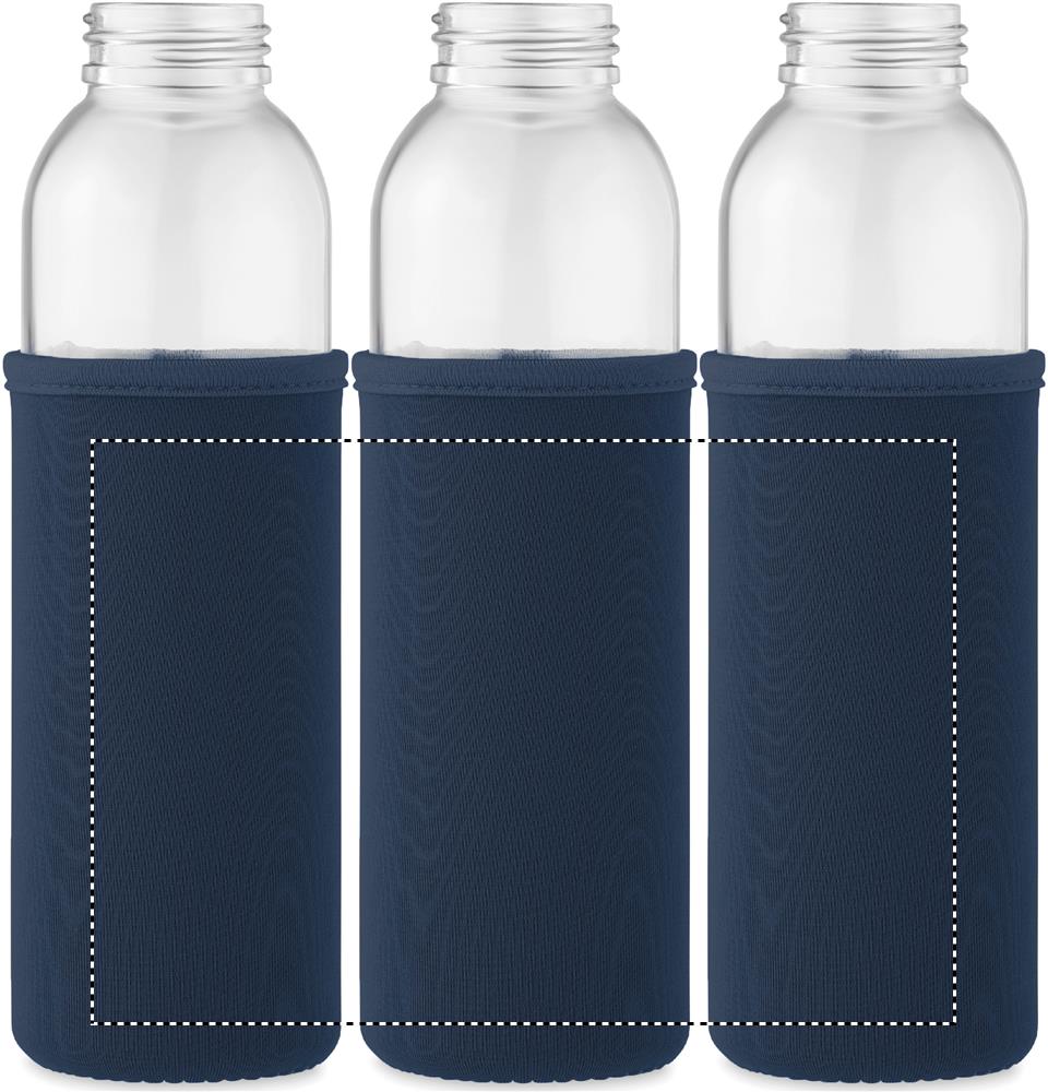 Recycled glass bottle with neoprene pouch and PP lid with silicone hanger. Leak free. Capacity: 500 ml.