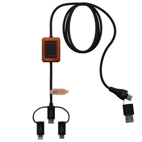 Rubber with bamboo finish charging cable with data transfer and double light-up logo. The cable is made from sustainable materials: recycled ABS plastic and rPET from recycled bottles. It can be used with Apple CarPlay and Android Auto for car apps. Thanks to its dual USB-A and USB-C output, the cable is 100% compatible with the latest computers on the market (USB-C). The cable can be customised with two light-up logos (one on each side). Cable length: 1 metre. Delivered in a biodegradable TPU pouch (17.5 x 5.5 cm) with a paper card. Includes 3 year warranty.