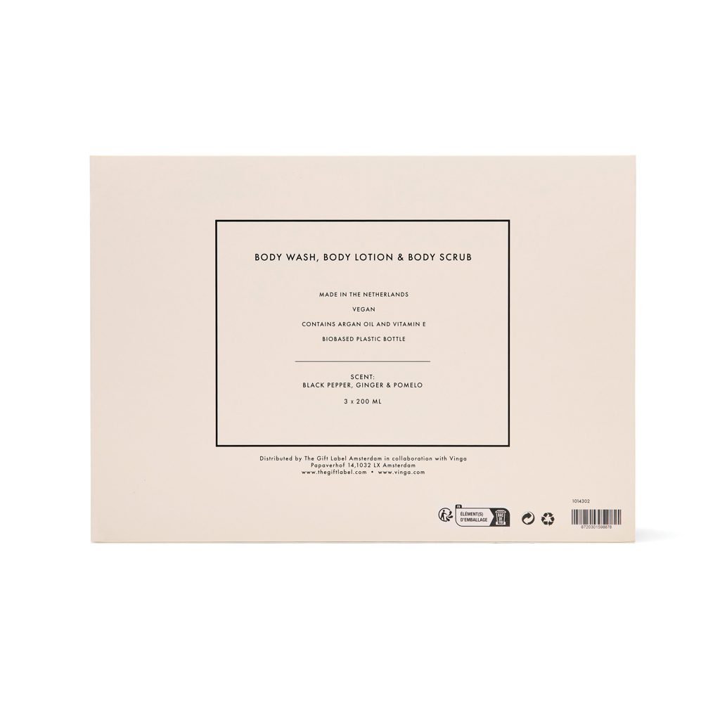 Lets turn every shower or bath into a luxurious ritual. This 3-piece set includes 200 ml tubes of body wash, body scrub and body lotion, crafted to nourish your skin from head to toe. Infused with the warm, zesty aroma of black pepper, ginger and pomelo it leaves your skin feeling smooth, refreshed and subtly fragranced. Elegantly packed in a giftbox in cream white and black.
