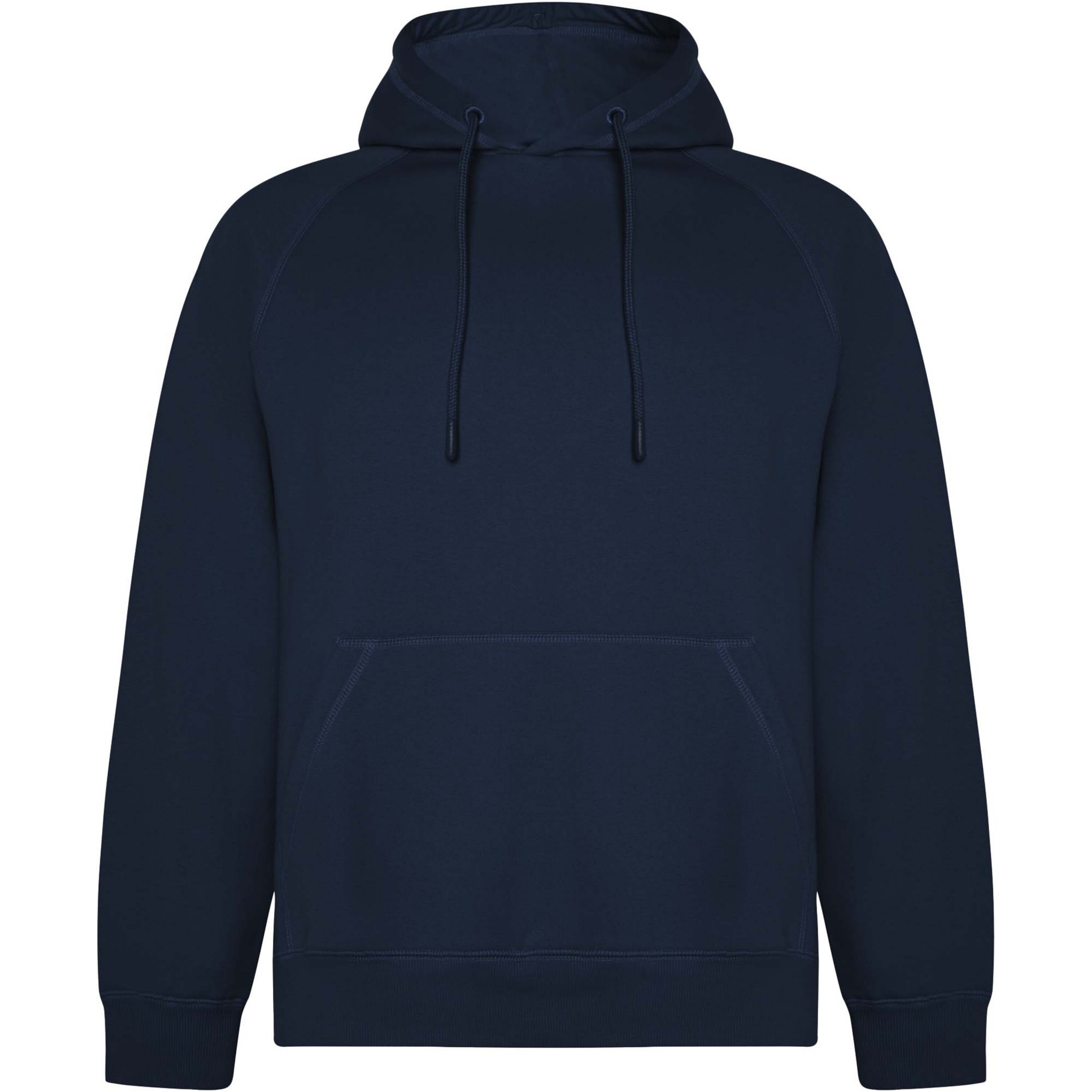 Unisex hoodie in organic cotton and recycled polyester. Kangaroo style pocket. Single jersey lining in hood. Round adjustable drawcord and embroidered eyelets. Cuffs and waistband in 2x1 ribbed fabric. Removable label. Individual recycled packing. The male model is 185 cm and is wearing size L, and the female model is 168 cm and is wearing size S.
