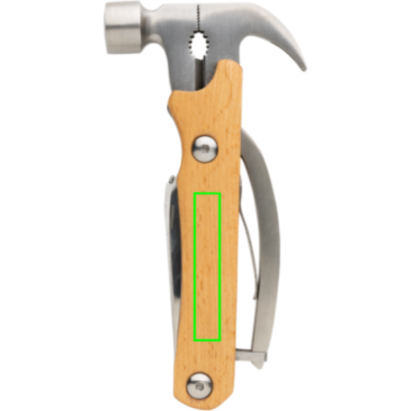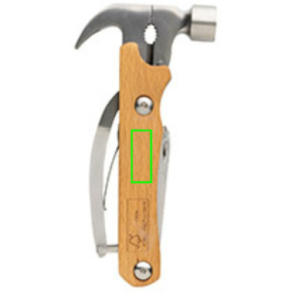 Hammer multi-tool made with FSC 100% beech wood, high hardness and corrosion resistant stainless steel (420). Rockwell hardness 42-52. The item comes with 10 functions: Plier, Nail ,Claw, Hammer, Wire cutter, File, Flat screwdriver, Bottle opener, Philips screwdriver, Saw, Knife. Blade is food safe. Packed in FSC mix kraft box.
