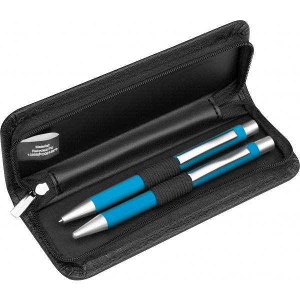 Writing set consisting of a blue-writing metal ballpoint pen with a plastic jumbo refill and a matching mechanical pencil with two 0.5mm pencil leads. Both pens feature a rubber finish surface for a pleasant feel, and the case is made from recycled PU.