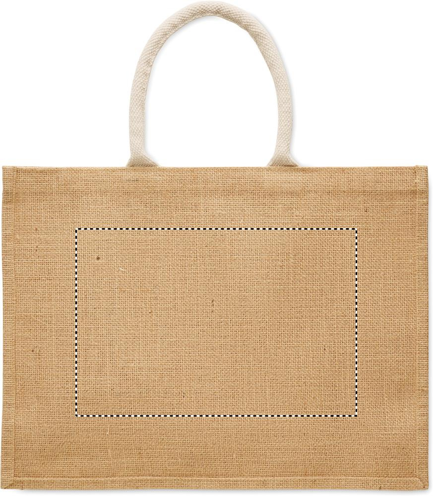 Lamineeritud džuudist ja 280 g/m² puuvillasest purjeriidest ostukott nöörsangadega. Sisaldab suurt avatud esitaskut.