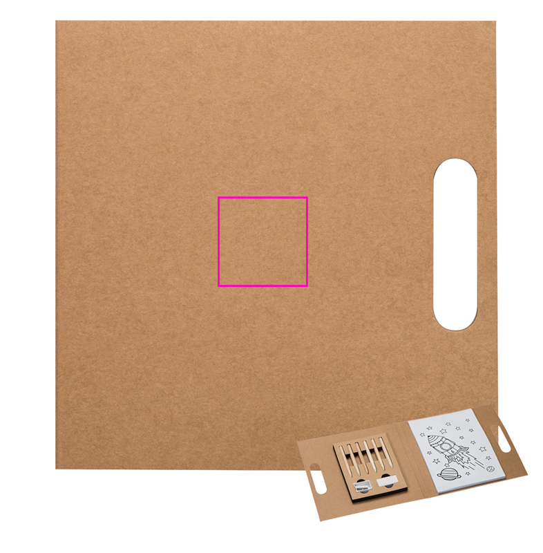 Taaskasutatud kaanega värvimisraamatu kaust, värviplokk (30 lehte), kandehoidja, teritaja, kustutuskumm ja 6 erinevat värvi värvipliiatsid. Teie logo trükitakse kaanele.