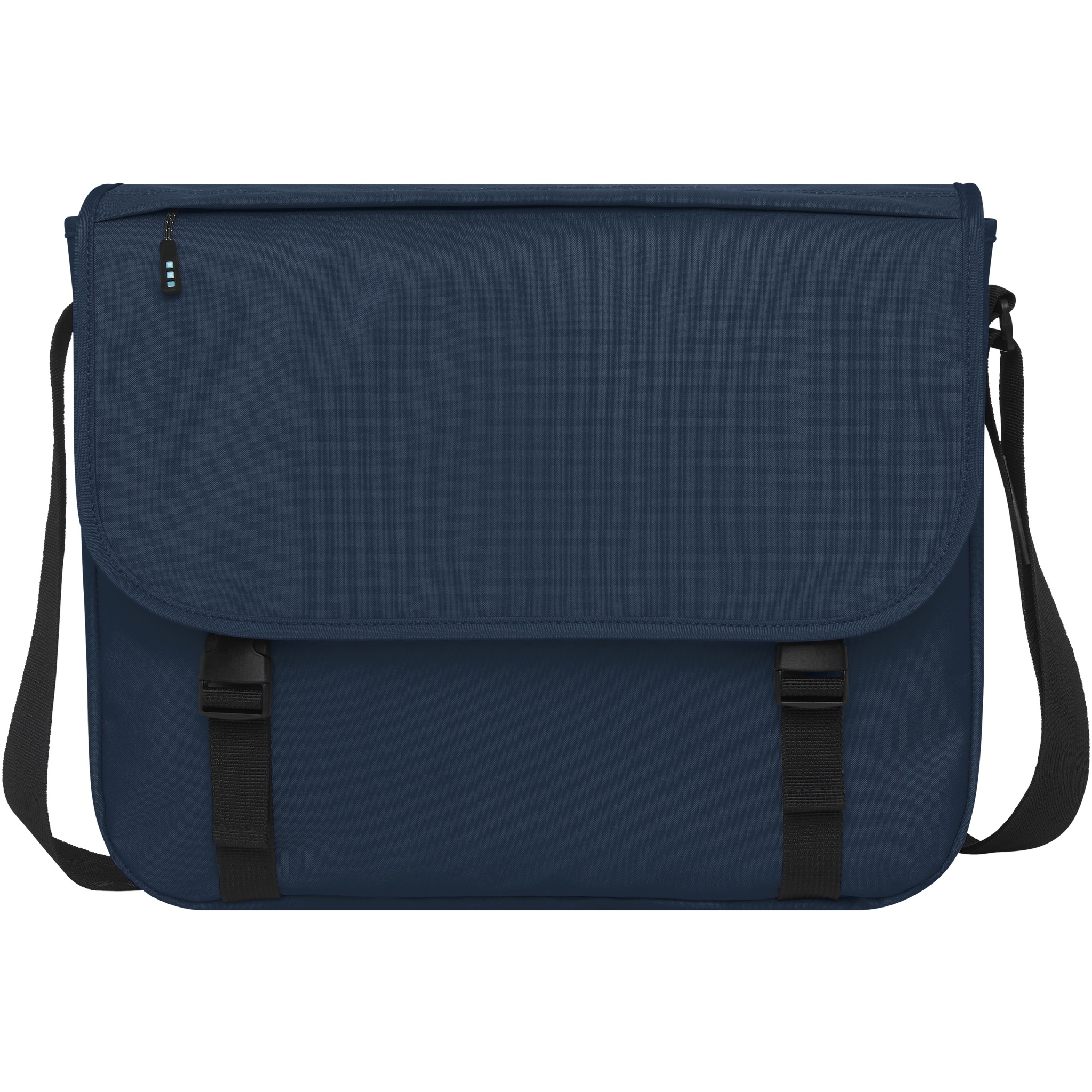 Kestävä, GRS-sertifioitu RPET-laukku kannettavalle, joka on valmistettu 60-prosenttisesti kierrätysmateriaaleista. Suuri vetoketjullinen päälokero, jossa on pehmustettu 15”:n kannettavan tietokoneen suojatasku ja etulokero (kummassakin tarranauhakiinnitykset). Mukana peiteläppä, jossa vetoketjullinen tasku ja solki. Takana on mukava pehmustettu ja säädettävä olkahihna ja vetokahvatunneli.