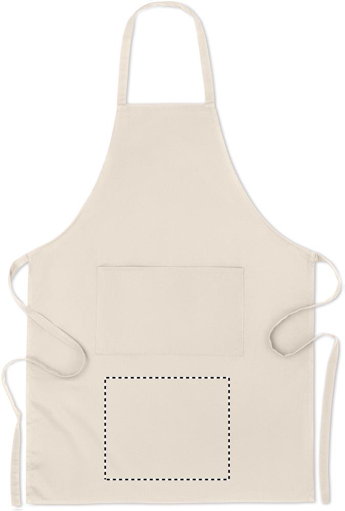 200 gr/m² orgaanisesta puuvillasta valmistettu esiliina, 2 etutaskulla.