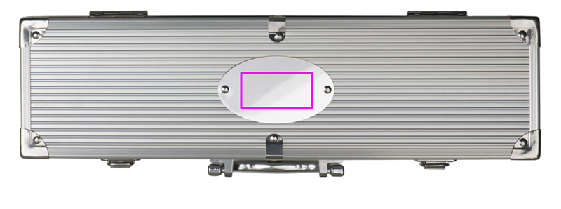 Grillikotelo, jossa on grillipihdit, lihahaarukka ja grillin kääntäjä metallikotelossa. Laserimme logosi kotelon soikeaan metallilevyyn.