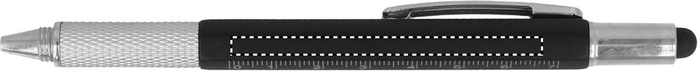 ABS-monitoimikynä mustalla musteella, kiertomekanismilla, viivoittimella ja kosketusnäyttöpäällä. Ristipää ja talttaruuvimeisseli.