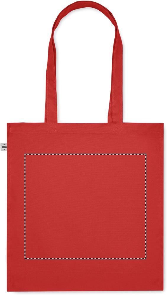 Luomupuuvillasta valmistettu ostoskassi, jossa on pitkät kahvat ja sivutaitteet. 220 gr/m².
