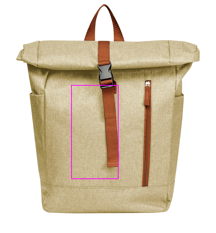 Reppu 500D polyesterista, taitettava tai rullattava suljin, pehmustetut olkaimet, kantokahva ja lukittava etutasku. Logosi painetaan etulokeroon.