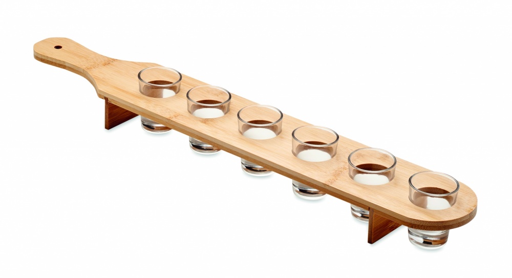6 stiklinių rinkinys ant bambukinio irklų padėklo. Talpa: 20 ml. Bambukas yra natūralus produktas, gali šiek tiek skirtis kiekvieno gaminio spalva ir dydis, o tai gali turėti įtakos galutiniam dekoravimo rezultatui.
