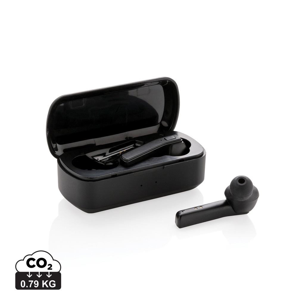 Tegul muzika sklando su šiomis tikromis belaidėmis ausinėmis įkrovimo dėkle. Ausinės turi 35 mAh bateriją ir jas galima pakartotinai įkrauti 500 mAh įkrovimo dėkle per 1 valandą. Su automatinio susiejimo funkcija, todėl lengva susieti su mobiliuoju įrenginiu. Grojimo laikas vidutiniu garsu apie 3 val. Su BT 5.0 optimaliam ryšiui. Veikimo atstumas iki 10 metrų. Su imtuvu ir mikrofonu. Įskaitant 3 dydžių silikoninius ausų antgalius. ABS medžiagos korpusas.
