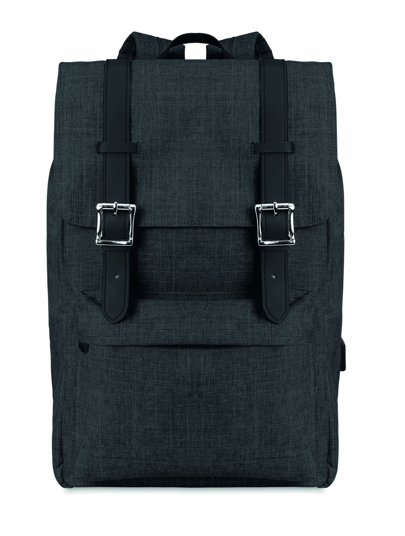Nešiojamojo kompiuterio kuprinė iš 600D 2 tonų poliesterio su paminkštintu pečių dirželiu, įskaitant vieną pagrindinį vidinį skyrių 15 colių nešiojamam kompiuteriui ir USB įkrovimo laidą. Apima magnetinį užsegimą ir vieną priekinį skyrių su užtrauktuku.
