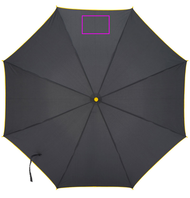 Automatinis skėtis iš 190T pongee su stiklo pluošto strypais, plastikine rankena, spalvotu apvadu, rankena ir rėmu. Atspausdiname Jūsų logotipą ant vieno segmento.