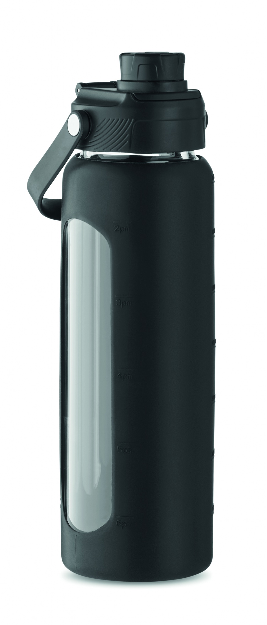 Augsta borsilikāta stikla pudele ar silikona caurspīdīgu uzmavu ar PP vāku un pārnēsāšanas rokturi. Bez noplūdēm. Tilpums: 750 ml.