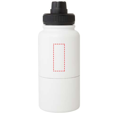 Многоразовая бутылка-термос из нержавеющей стали, сертифицированная RCS, со съемным контейнером для хранения. В верхней части бутылка имеет медный изолированный термос объемом 530 мл, который сохраняет напитки горячими или холодными в течение нескольких часов. Нижняя часть представляет собой контейнер с двойными стенками, вмещающий до 340 мл. Его можно использовать как чашку для любимых холодных напитков или для хранения закусок или других мелочей. Поставляется в подарочной коробке из переработанного картона.
