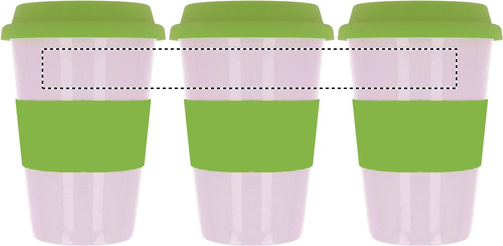 Одностенчатая керамическая кружка с силиконовой крышкой и ободком. Емкость 400мл . Керамотрансфер подойдет для мытья в посудомоечной машине. Поскольку это одностенчатая кружка , осторожно - может нагреваться!