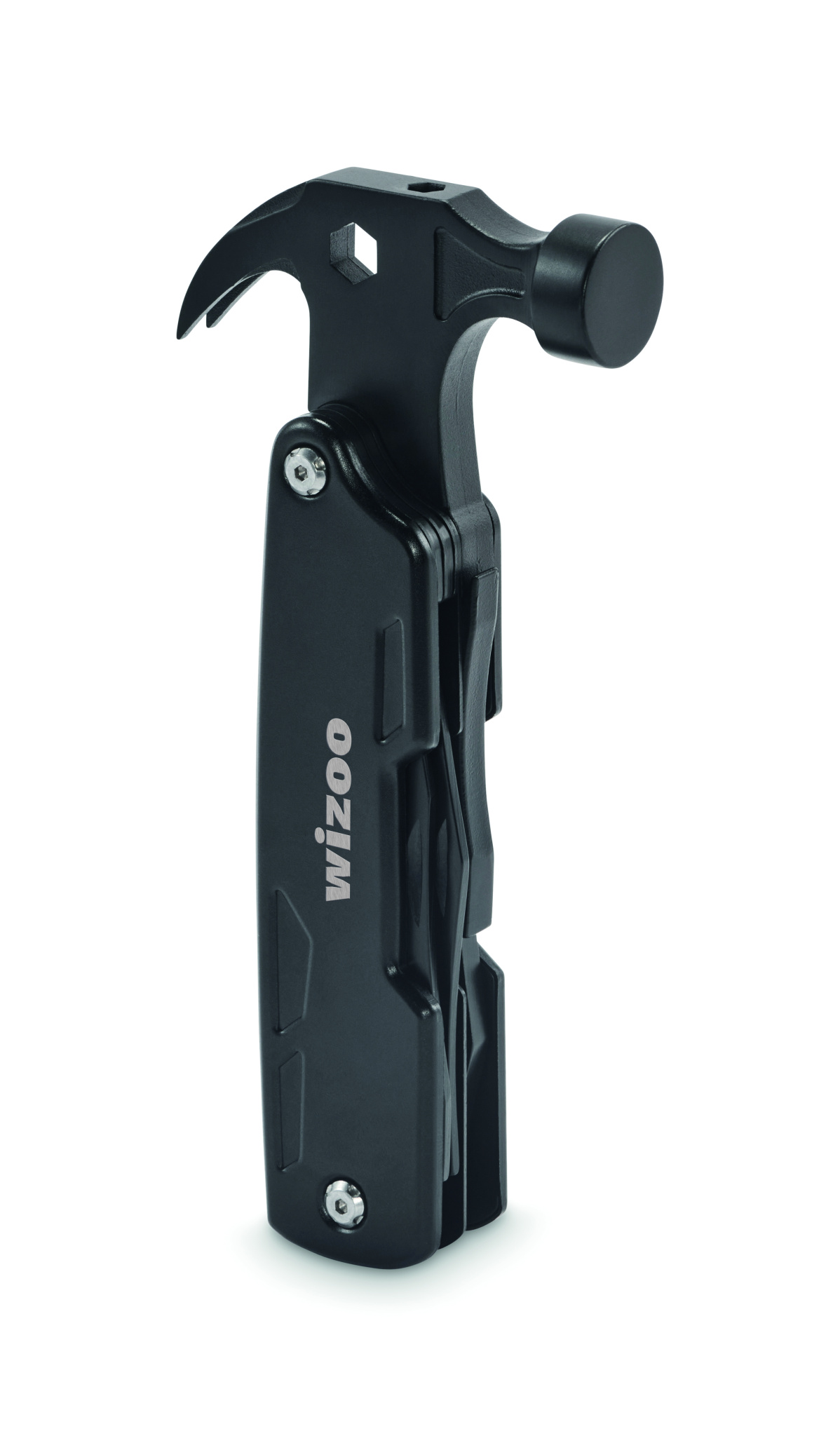 14-in-1 stainless steel multi tool hammer. With nail puller, hex wrench, serrated knife, steel file, variety of screwdrivers, regular pliers, needle-nose pliers, bottle opener, knife, wire cutter.