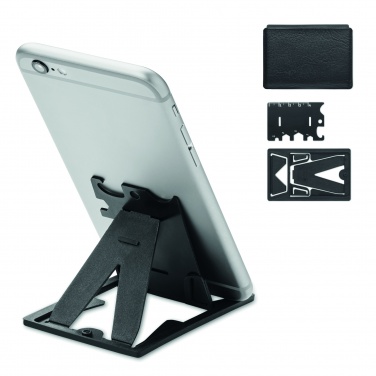 Многофункциональный инструмент из нержавеющей стали и полипропилена с подставкой для телефона в полиуретановом чехле. Включает отвертки, линейку, шестигранный ключ и открывалку для бутылок.