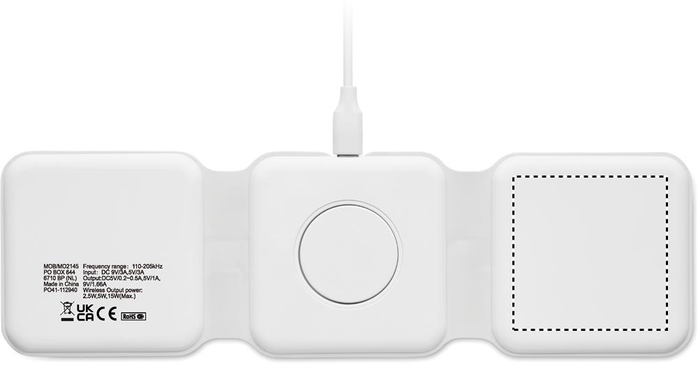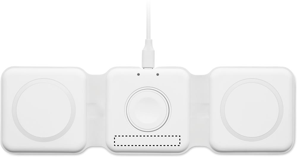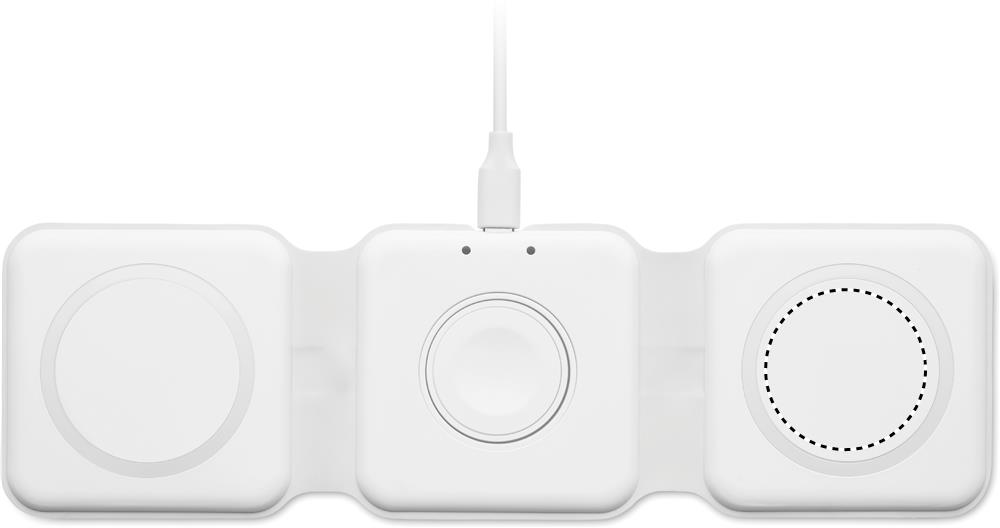 Складная пластиковая зарядная станция 3 в 1. Имеет 3 точки для беспроводной зарядки. Вход: 2-в-1 Type-C и Type-A. Совместима со всеми устройствами с поддержкой QI, такими как последние модели Android, iPhone® 8, X и более новые. Также совместима с часами iWatch.