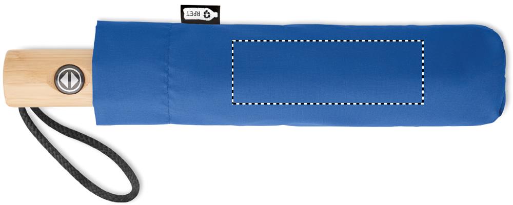 Зонт реверсивный 23-дюймовый из эпонжа RPET 190T. Автомат. Спицы из стекловолокна. Бамбуковая ручка с хлопковым ремешком на запястье. Футляр так же RPET.