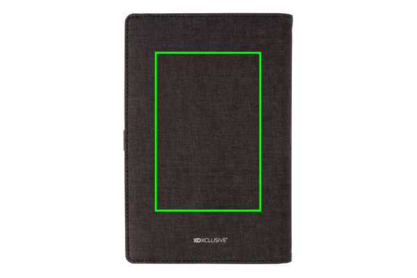 Påfyllningsbart omslag för anteckningsbok med 5W trådlös laddning. Omslaget är tillverkat i polyester och har ett elastiskt band. Anteckningsboken på insidan har ett svart PU cover och har 80 blad/160 sidor linjerat cremefärgat papper, 70gr/m2. 80 cm micro USB kabel medföljer. Input: 5.0V/2.0 A. Output: 5.0V/1A. Registrerad design®