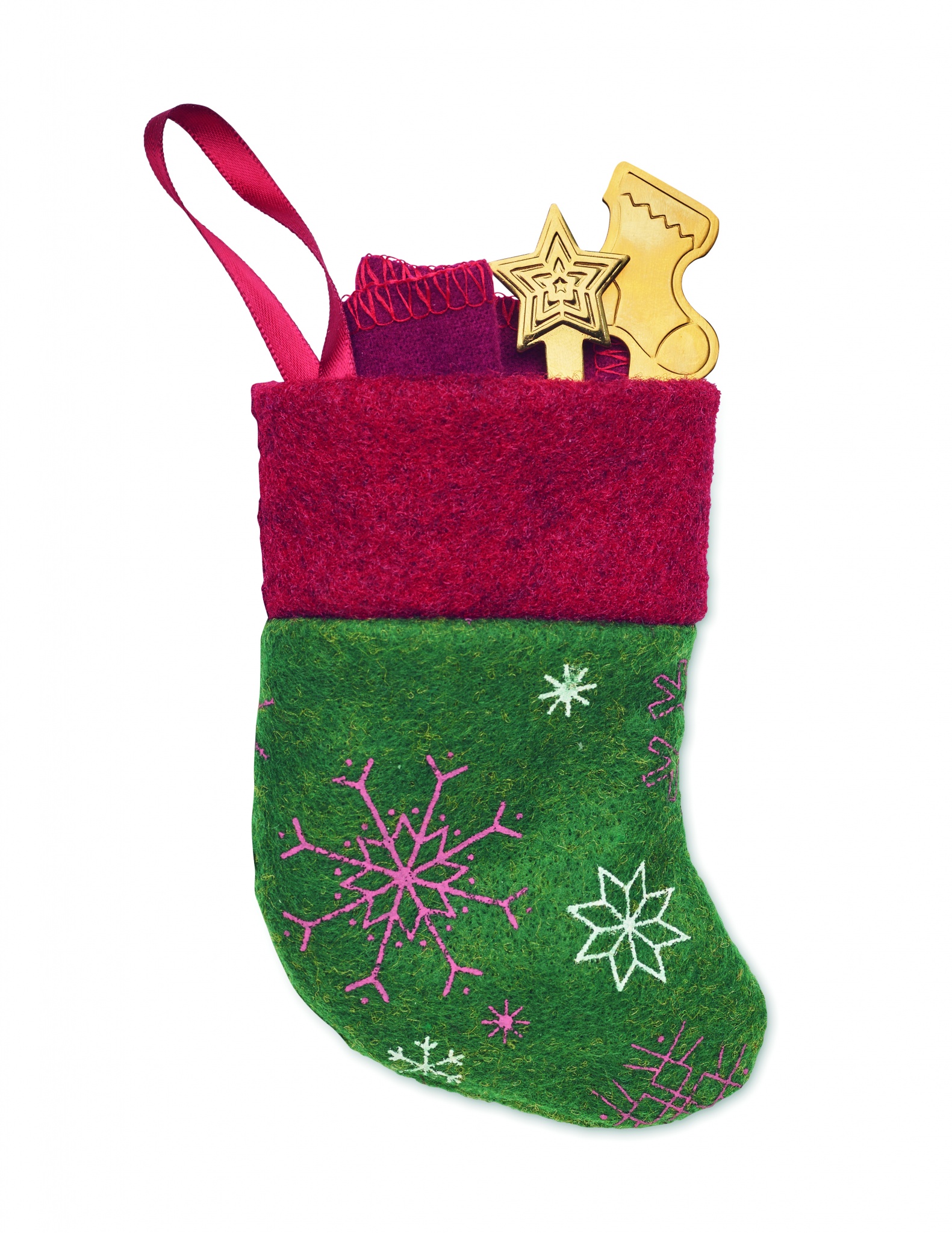 Bestickset för julbord med sked och gaffel i rostfritt stål och en 150 gr/m² bomullsservett. Kommer i en julstrumpeformad påse.