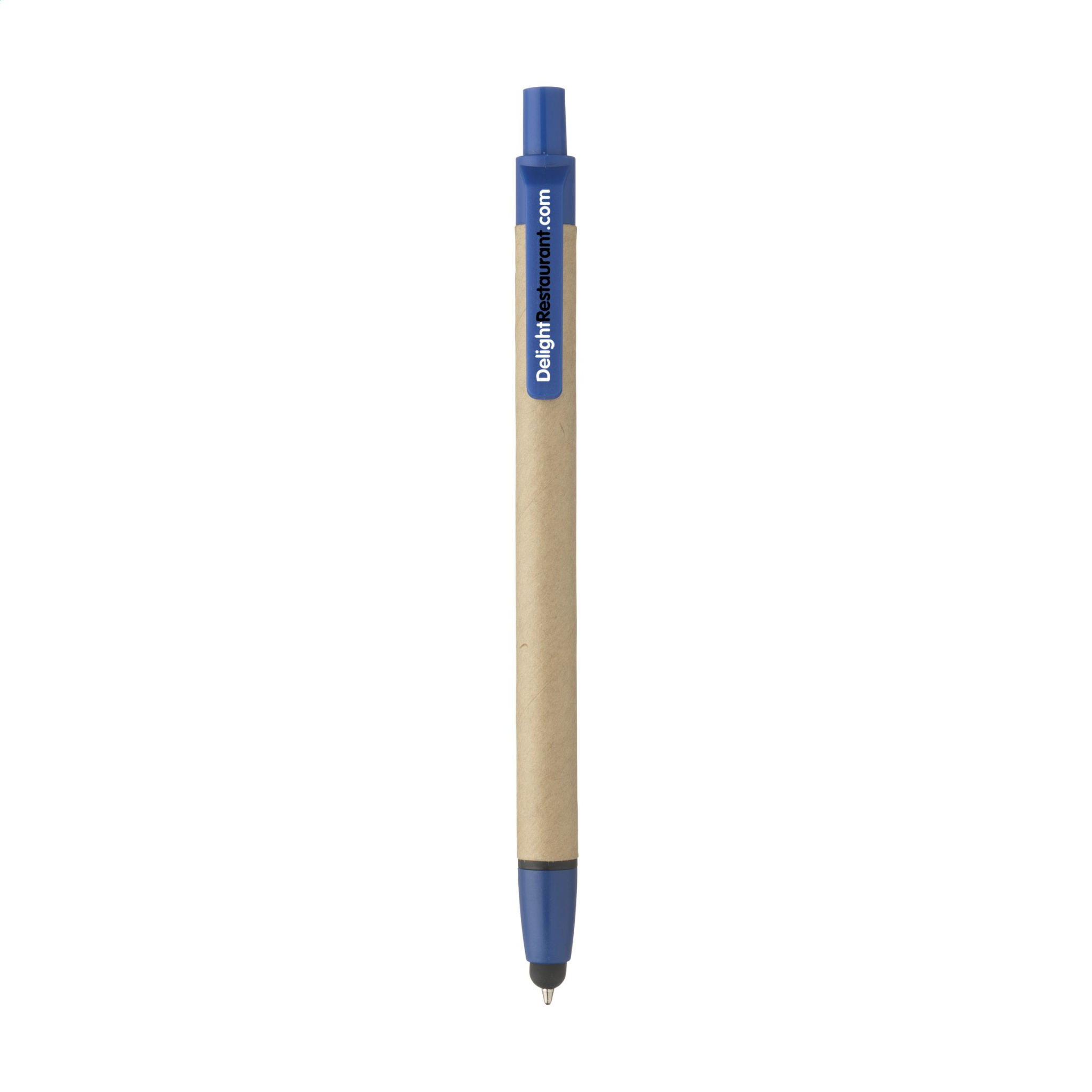 WoW! Kulspetspenna med blått bläck med cylinder, gjord av återvunnen kartong, gummipekare för att styra pekskärmar och plastdetaljer.