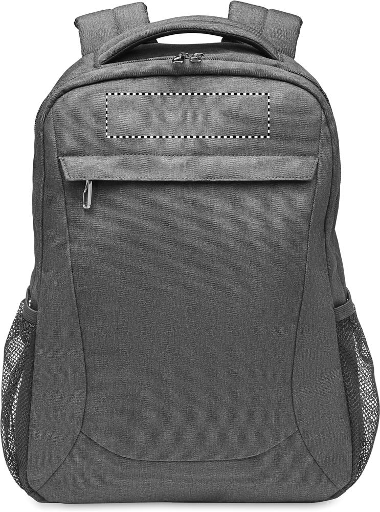 Ryggsäck med plats bärbar dator på 15 tum i 600D RPET-polyester. Invändigt fack för bärbar dator och små flera innerfack. Den har en ficka med dragkedja på framsidan och 2 nätfickor på sidan. Justerbara axelremmar. Trolleyhållare på baksidan.